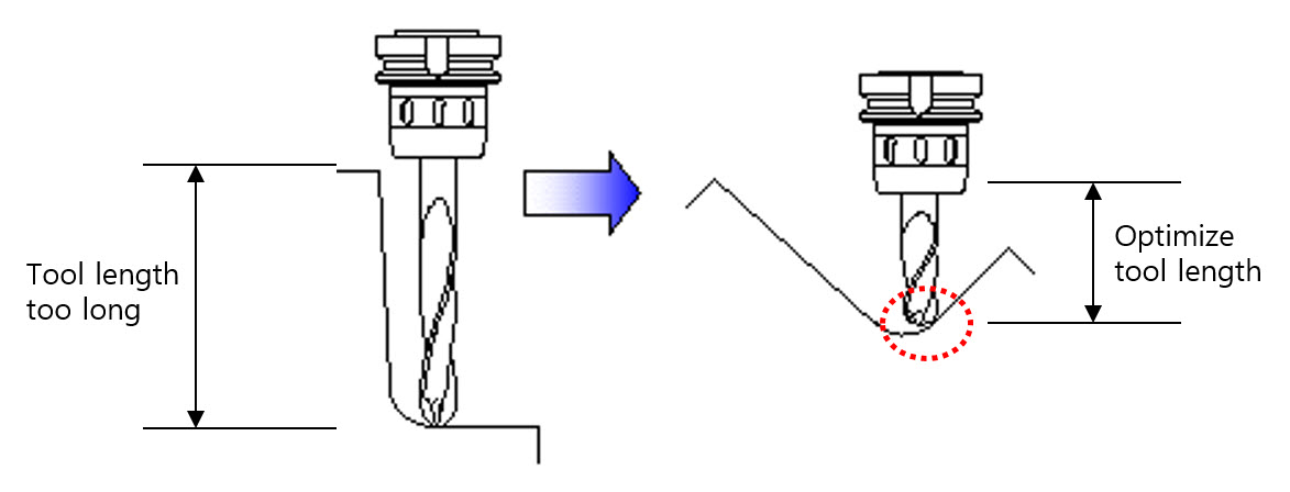 - Phải gá dao dài khi gia công những lòng khuôn quá sâu. Việc này có rất nhiều hạn chế như i) độ cứng vững kém làm tăng nguy cơ gãy dao, ii) phải gia công ở tốc độ thấp nên năng suất gia công không cao và iii) chất lượng bề mặt không cao do có nhiều rung động trong khi gia công.