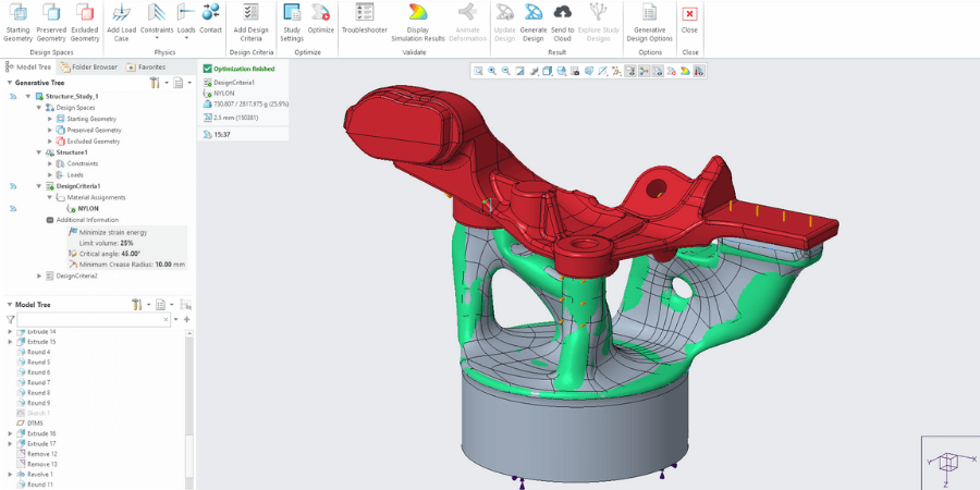 Như vậy, bạn đã xác định được các rằng buộc trong Creo. Cụ thể đó là hướng in sản phẩm (một góc giới hạn 45 độ), bán kính được tạo ra nhỏ nhất là 10mm và vật liệu sử dụng là Nylon. Sau đó bạn dùng phương pháp tự sinh để tạo ra một đồ gá tối ưu dựa trên những yêu cầu của bạn.